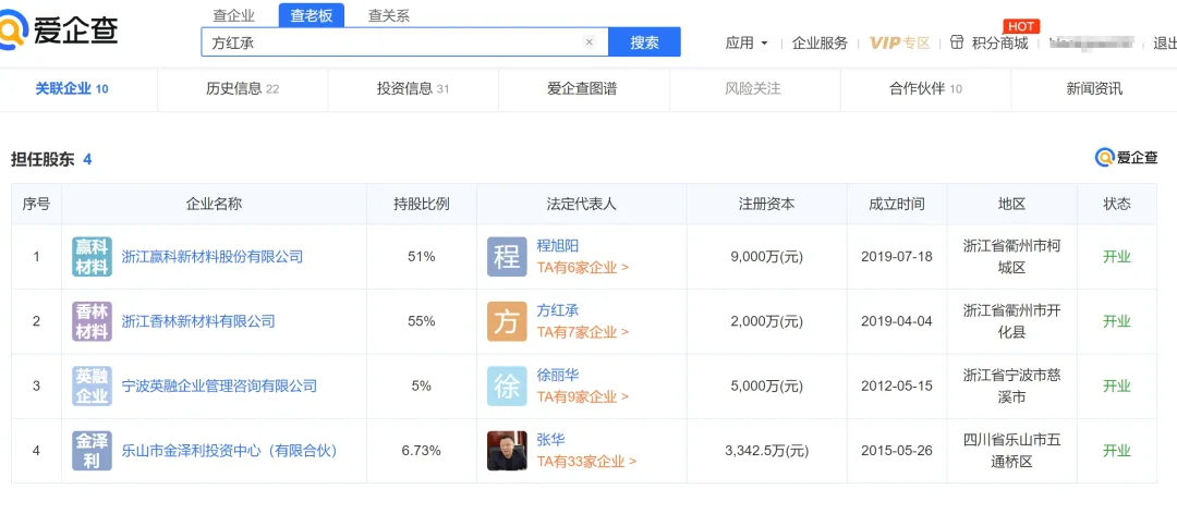 对比之下,方红承在来到合盛前,基本是在浙江新安化工集团营销部门工作,创业经历集中于离开合盛后。目前其在4家公司有持股,整体来看还是专注于化工行业。