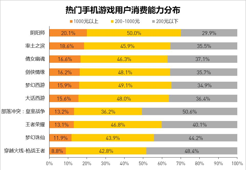 从用户的消费欲望和消费能力来看,《阴阳师》在“用户消费能力”和“手机终端价格”这两项指标上都是遥遥领先的。《阴阳师》游戏用户消费200元以下的占比29.9%,消费200—1000元的占比50%,消费1000元以上的占比20.1%。在消费高于1000元的等级中,只有《阴阳师》超过了20%,也就是说,与其他游戏相比,《阴阳师》玩家群体中高消费玩家占比更高,大R更多。