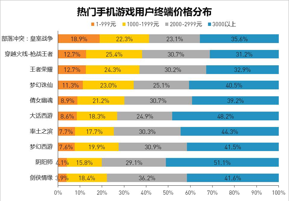 而在用户终端设备价格上,《阴阳师》玩家使用3000元以上价格手机的用户最多,占比51.1%;最低的为《穿越火线》和《王者荣耀》,分别占比31.2%和32.9%。这在一定程度上说明了《阴阳师》玩家群体的消费能力更高一些。消费欲望强、消费能力高,也难怪,《阴阳师》的收入会如此惊人。