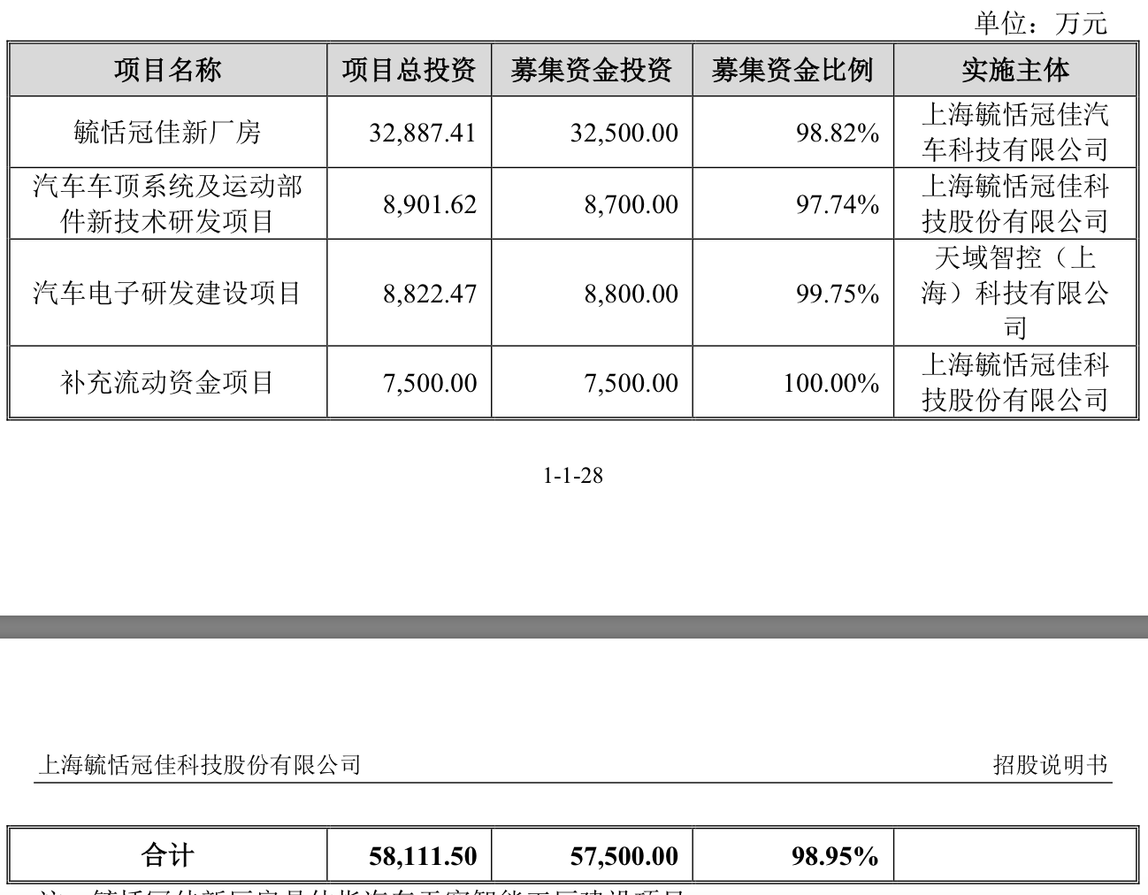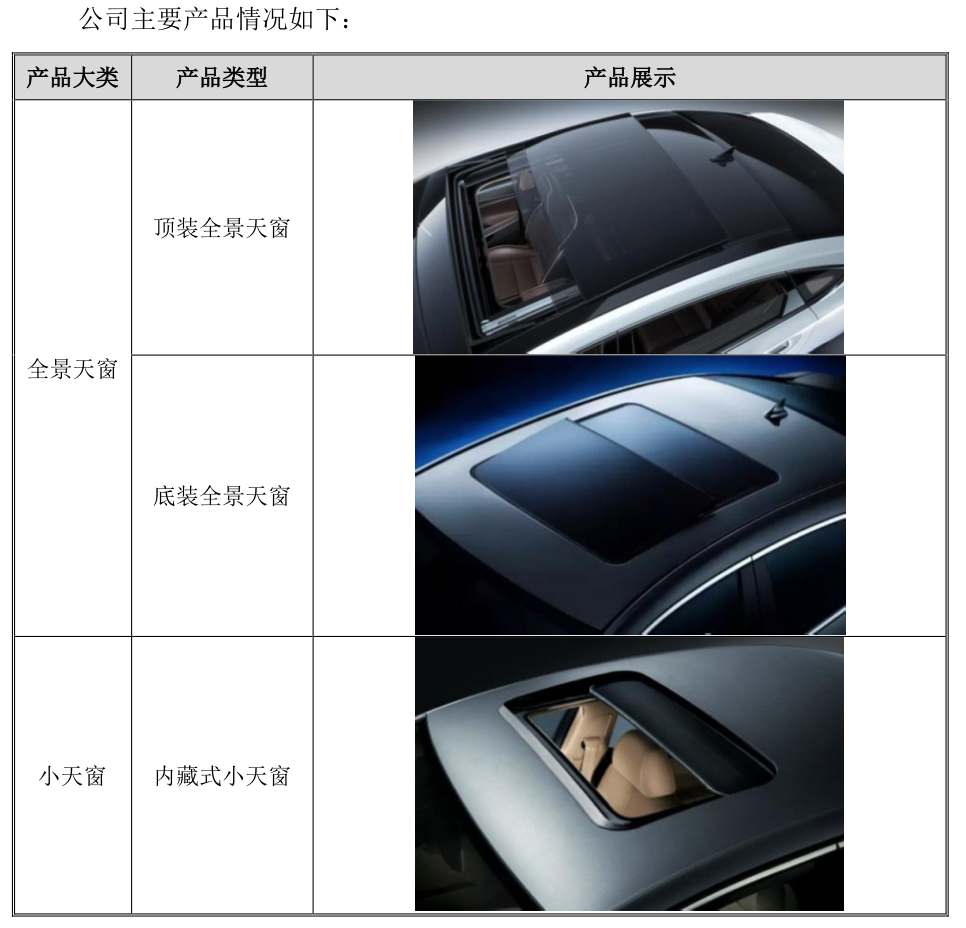 说明书显示,毓恬冠佳是以汽车天窗为主要产品的汽车运动部件制造商,拥有汽车天窗设计、研发、生产一体能力。公司目前主要客户包括长安汽车、一汽集团、吉利汽车、广汽集团、上汽大众、长城汽车等国内知名整车厂。