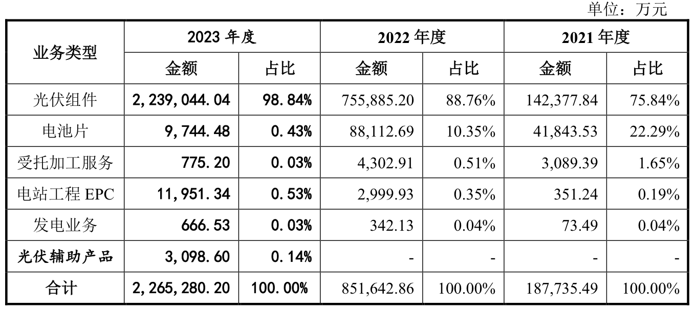资料显示,一道新能是一家以高效光伏电池、组件研发、生产、销售为引领的多场景光伏应用生态解决方案提供商。公司专注于高效太阳能电池片、组件的研发、生产和销售,并逐步拓展到下游光伏电站领域,2023年营收达227.24亿元,2021年度-2023年度复合增长率为246.39%。
