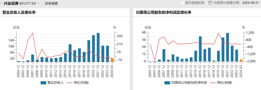 进入2024年,兴业证券的整体业绩增速仍有待拉升。2024年一季度,兴业证券营业总收入23.77亿元,同比降低42.99%;归母净利润3.28亿元,同比降低60.38%。