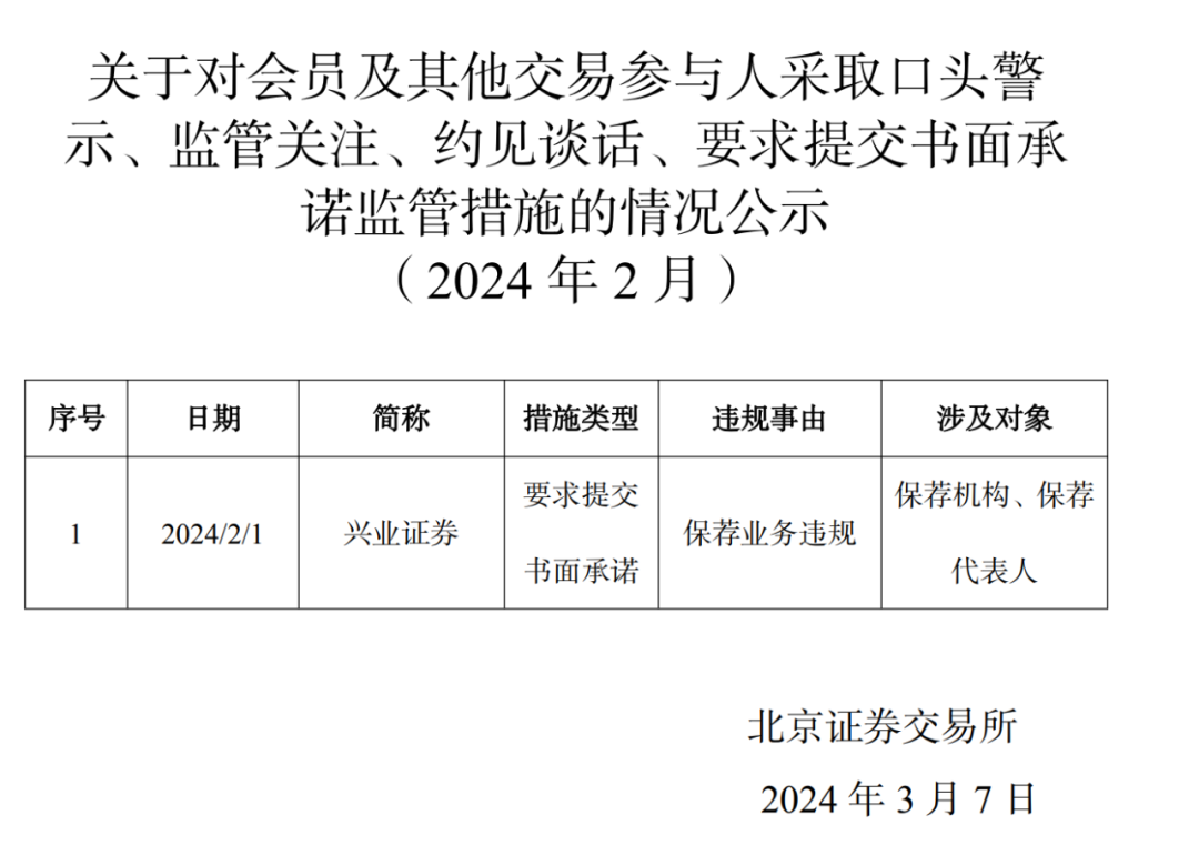此外,据北交所公告显示,3月7日,兴业证券因保荐业务违规,被要求提交书面承诺。