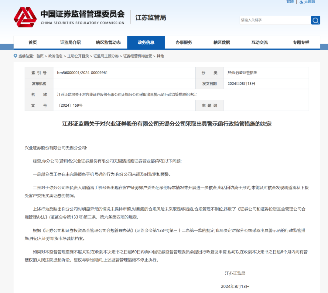 8月13日,江苏证监局公告,对兴业证券无锡分公司,以及该分公司原负责人胡道雷分别采取出具警示函的行政监管措施。