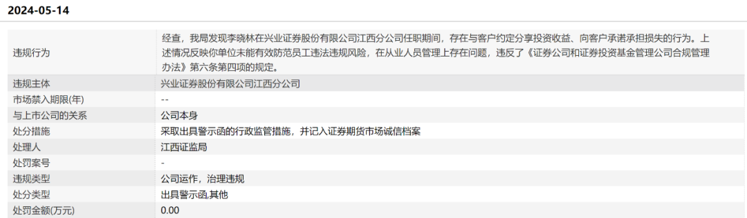 5月14日,江西证监局公告,对兴业证券江西分公司出具警示函,原因是员工李晓林在兴业证券江西分公司任职期间,存在与客户约定分享投资收益、向客户承诺承担损失的行为。