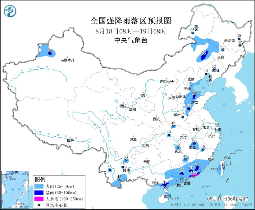 预计,8月18日08时至19日08时,内蒙古中东部、黑龙江南部、吉林西部、辽宁中南部、天津、河北东部、山东北部和西部、河南东部和南部、湖北西部、江西、湖南东部、福建南部、广西东部和南部、广东、海南岛东部、台湾岛,以及云南中南部、新疆伊犁河谷和北疆南部等地部分地区有大到暴雨,其中,广东东南部沿海等地部分地区有大暴雨(100~120毫米)。上述部分地区伴有短时强降水(最大小时降雨量30~50毫米,局地可超过70毫米),局地有雷暴大风等强对流天气。