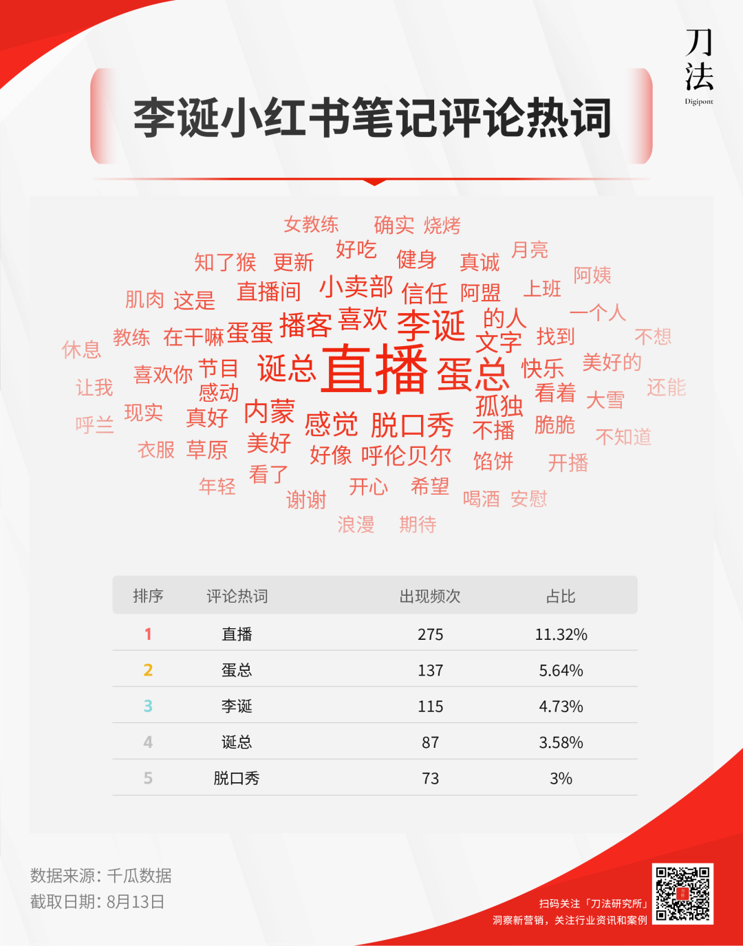 类似心态在粉丝评论里有直观表现。据千瓜数据,“直播”位列李诞的评论热词 TOP1。李诞小红书笔记下方常有粉丝留言求催更,“想蛋总直播了,没有蛋总的直播睡眠质量都不好了”,也有严厉网友表示,“不直播别发小红书!”