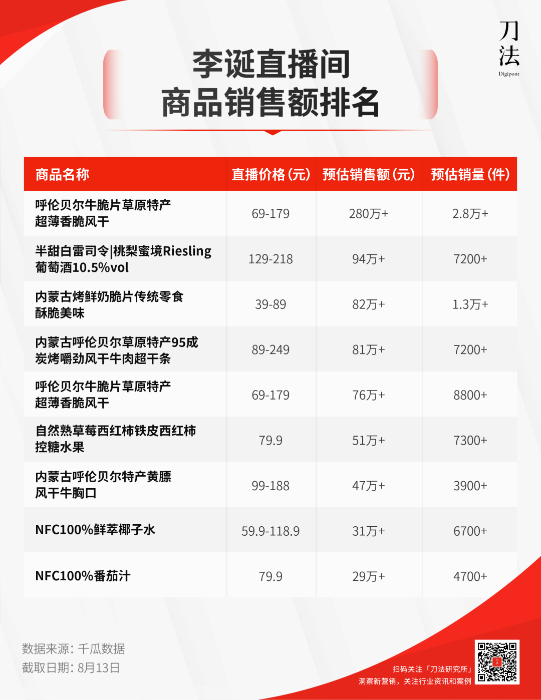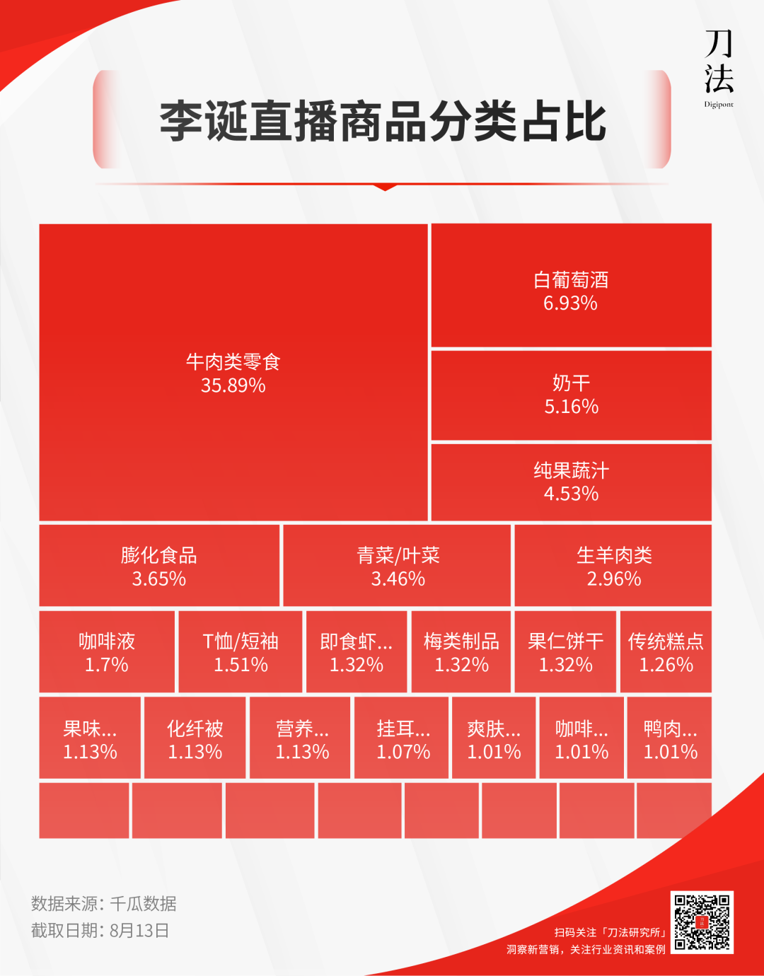 不过,虽然客单不高,但对零食来说并不算低。就同一单品而言,直播间价格也并非全网最低。比如,排名第一的牛脆片,在淘宝价格为 61.9 元每盒,李诞直播间的活动价为 63.9 元、常规价 69 元。