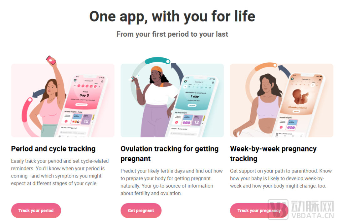 “一款应用,服务一生”—— Flo Health功能介绍,图源:企业官网