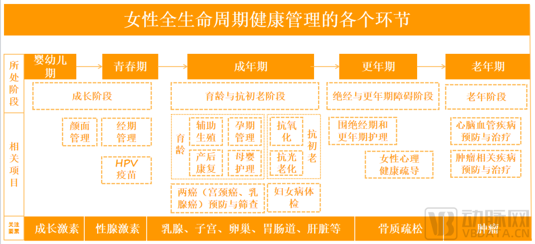 对此,动脉网对女性全生命周期健康管理进行了粗略划分,大致概括为婴幼儿期、青春期、成年期(包含孕产期)、更年期、老年期5个阶段。
