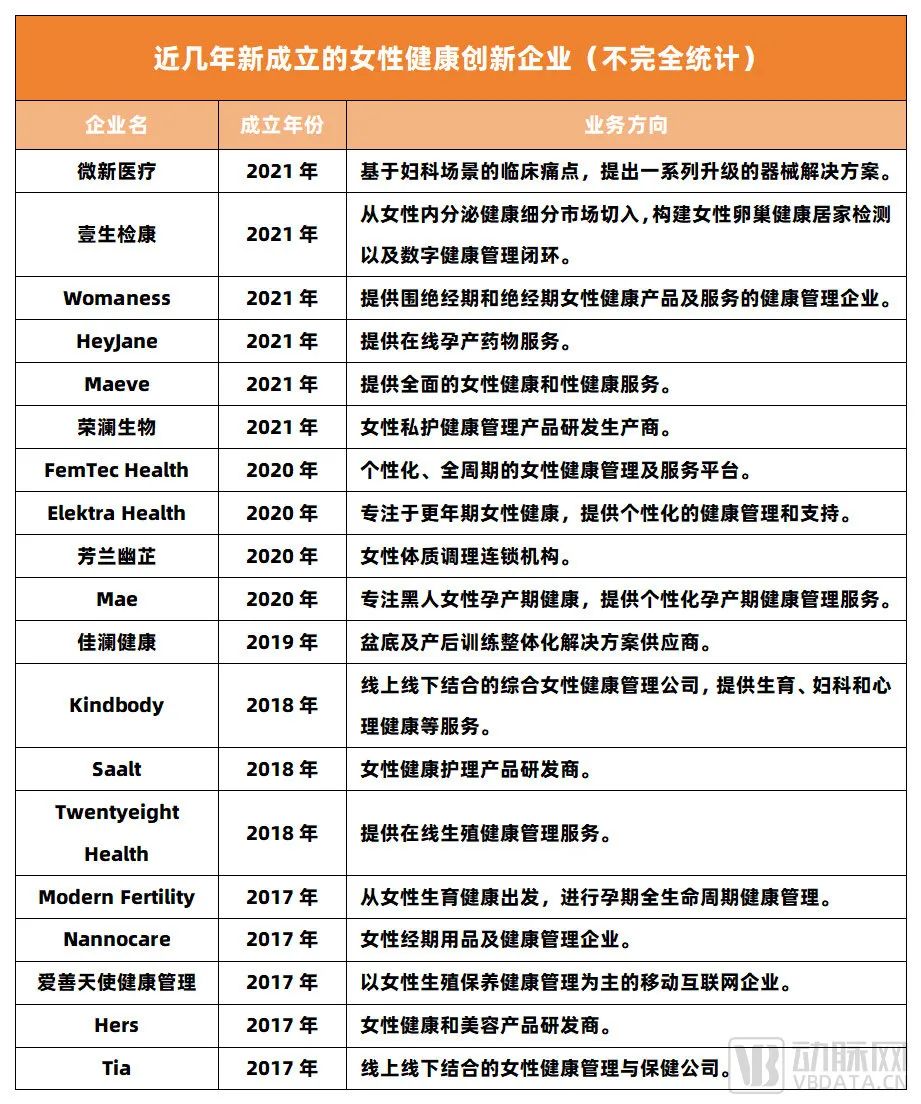 此外,动脉网也观察发现,近几年下场到女性健康管理赛道的创业企业络绎不绝,例如国外的FemTec Health、Tia、Oova、Ava Women、Teal Health等,以及国内的壹生检康、微新医疗、品嘉健康、恩视微、明兰世迦等。
