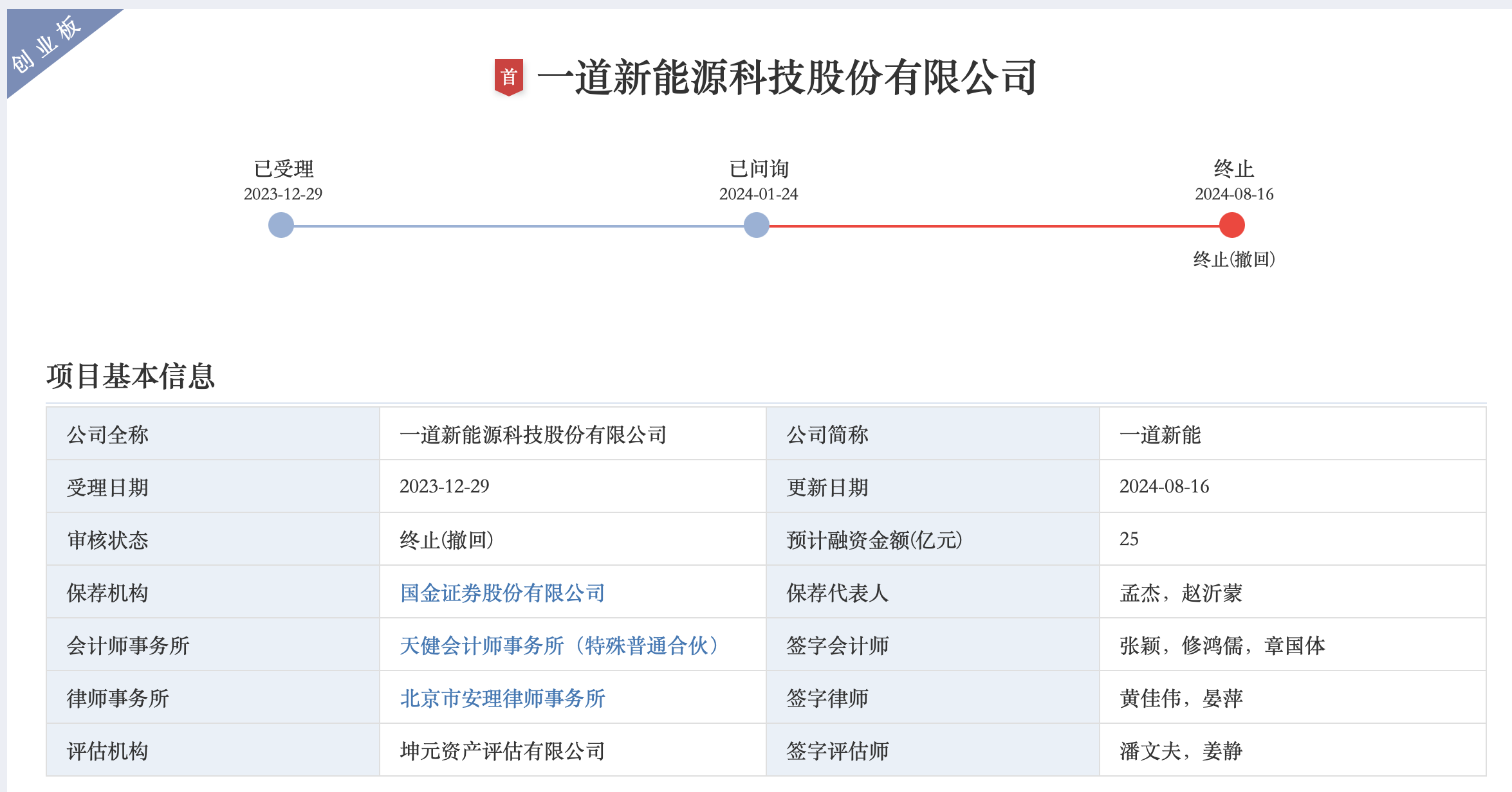 8月16日晚,深交所官网显示,因保荐人撤回发行上市申请,根据《深圳证券交易所股票发行上市审核规则》第六十二条,终止一道新能发行上市审核。