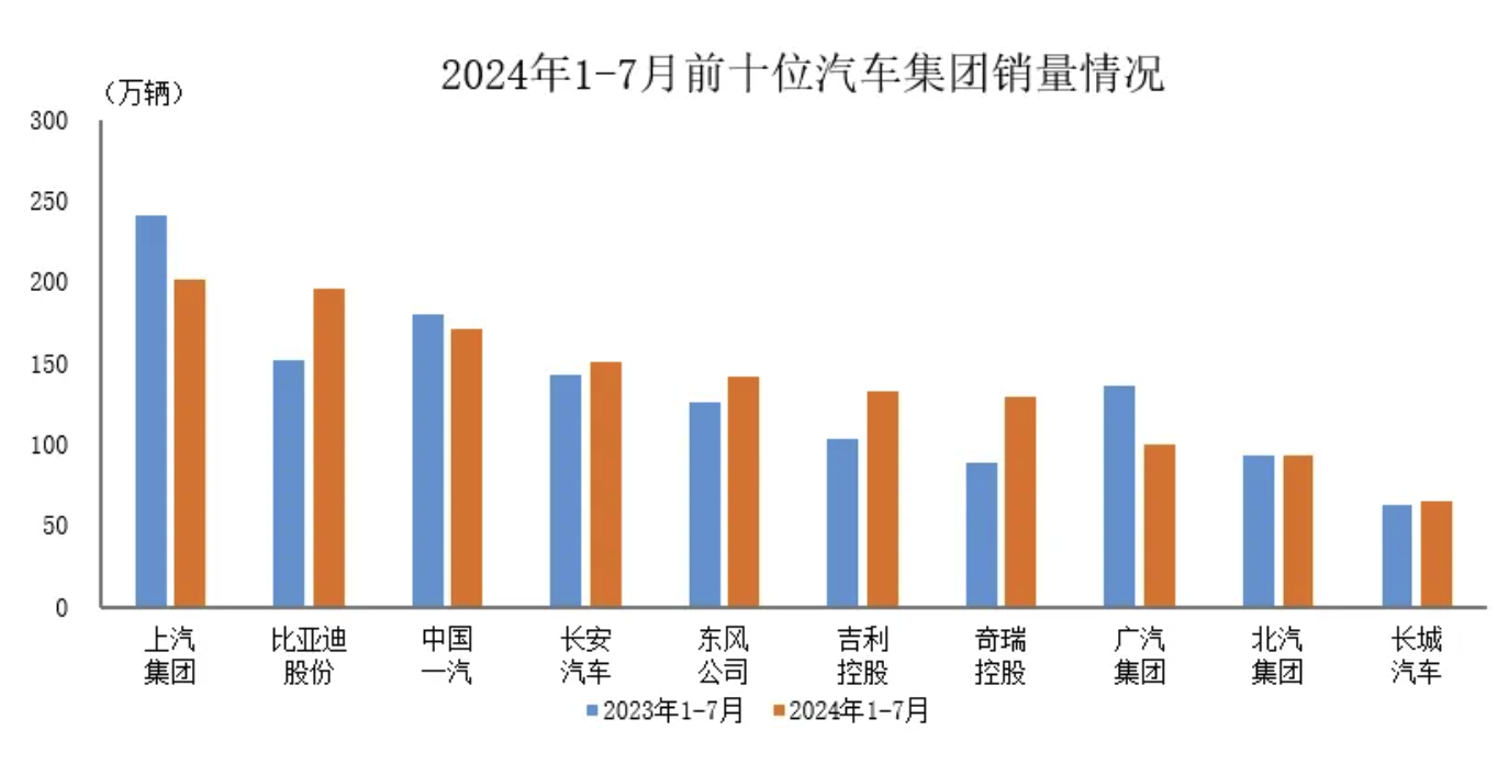 8月19日,据中国汽车工业协会统计分析,2024年1-7月,汽车销量排名前十位的企业(集团)共销售1380.3万辆,占汽车销售总量的84.6%。在上述十家企业中,与上年同期相比,上汽集团、中国一汽、广汽集团和北汽集团销量呈不同程度下降,其他企业销量均呈不同程度增长,其中奇瑞控股增速最为显著。