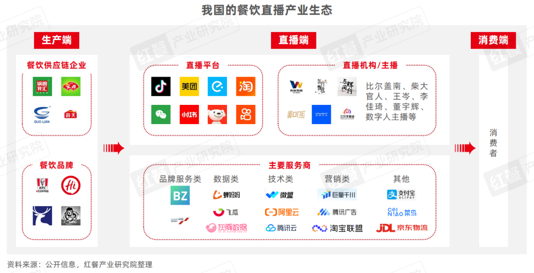 在餐饮行业发展和技术进步的推动下,餐饮企业、电商平台、内容平台、直播机构等都参与到餐饮直播的行列当中,它们围绕餐饮卖货、提升品牌形象和影响力等内容进行直播,促进餐饮直播产业链逐步走向成熟。