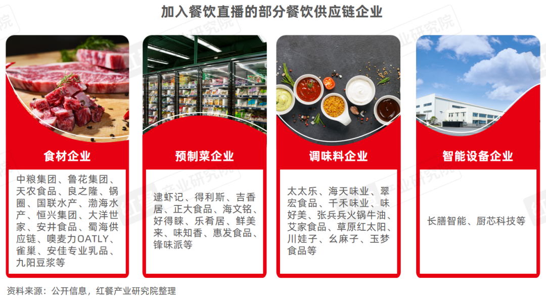 餐饮供应链企业当中,加入餐饮直播阵列的企业有中粮集团、国联水产等食材企业,乐肴居、得利斯等预制菜企业,太太乐、味好美等调味料企业,以及长膳智能等智能设备企业,参与者众多。