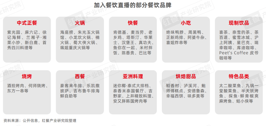 不少餐饮品牌也加入了这场“流量狂欢”。经红餐产业研究院统计,在抖音、淘宝、美团等众多直播平台上,餐饮行业的各个领域均有不少品牌开启直播之路,例如海底捞、肯德基、喜茶、泸溪河、太二酸菜鱼等。