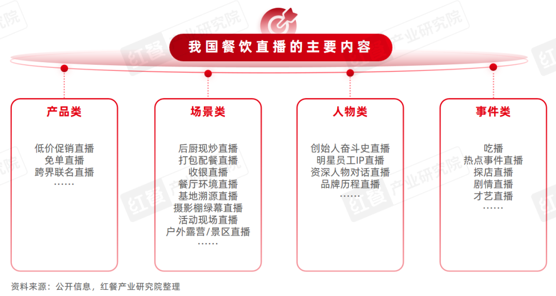 为了进一步打造差异化,增强粉丝粘性、助力品牌出圈,餐饮商家引入经典人物,打造沉浸式实景,讲述吸引力强的故事,例如采用活动现场直播、创始人直播、剧情直播等。由此,我国餐饮直播逐渐形成了产品类、场景类、人物类、事件类等四大主要内容。