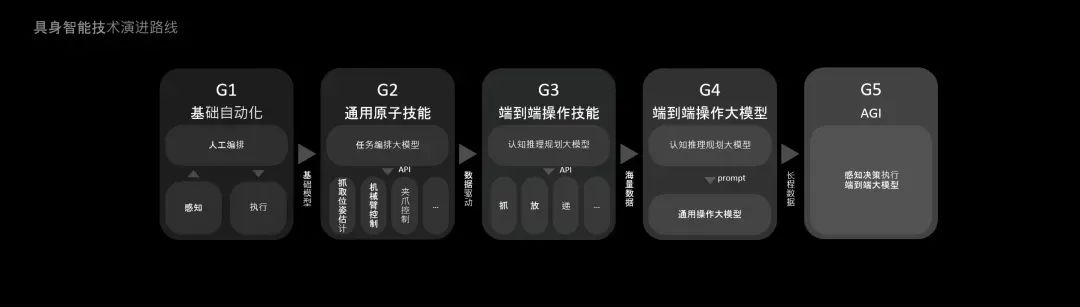 与“三电系统”类似,智元机器人还借鉴自动驾驶从L1到L5成熟的技术分级体系,对具身智能技术演进路线,进行了G1至G5的划分:G1基础自动化、G2通用原子技能、G3端到端操作技能、G4端到端操作大模型、G5 AGI。