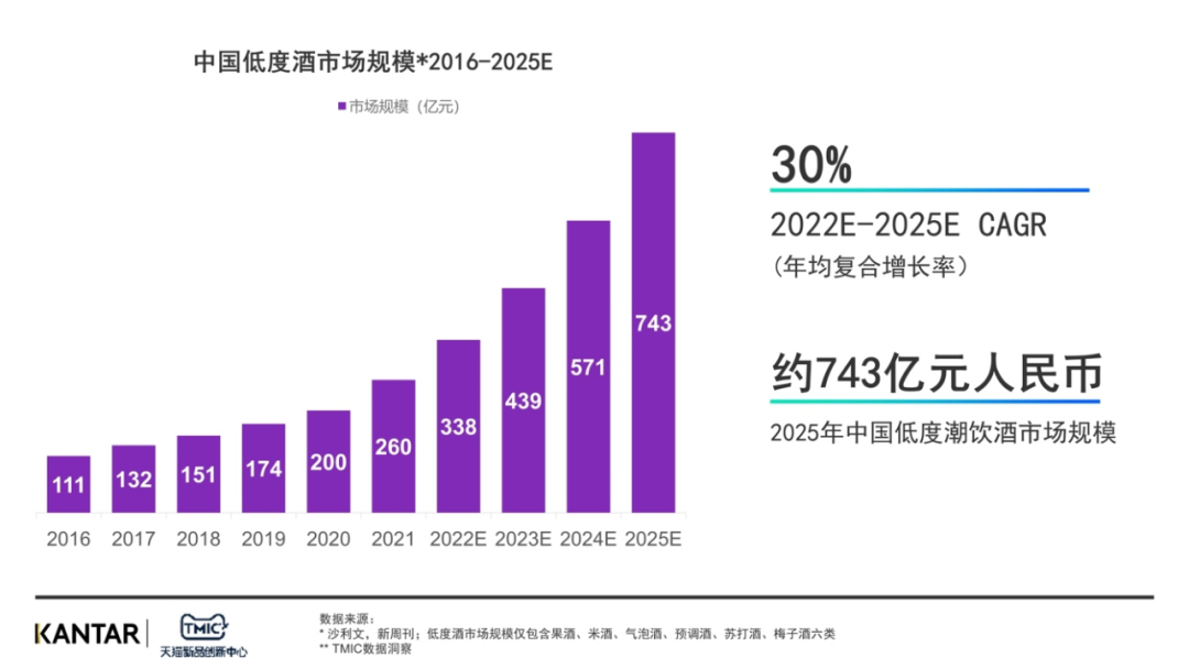 据TMIC&凯度发布的统计数据显示,中国低度酒市场规模预计2025年预计将超过700亿元。但低度酒包含了大量细分品类,例如预调鸡尾酒、果酒、苏打酒、梅酒、米酒等十多个细分市场;分散下来,每个细分市场的份额可能无法尽如人意。以此看来,销售突破10亿元的“梅见”还能保持高速增长多久?