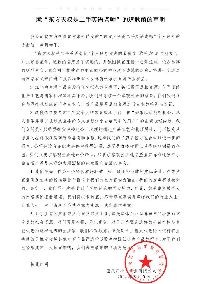 对此,江小白迅速发表官方声明,给出强有力的反击,强调其所有白酒产品,均采用纯粮固态发酵酿造工艺,酿造原料只有水和高粱,产品执行标准为代号GB/T26761(优级)的小曲固态法白酒国标;并表示已向相关主管部门进行投诉,同时要求东方甄选就此事公开道歉并消除影响,将保留进一步追究东方甄选以及主播天权法律责任的权利。