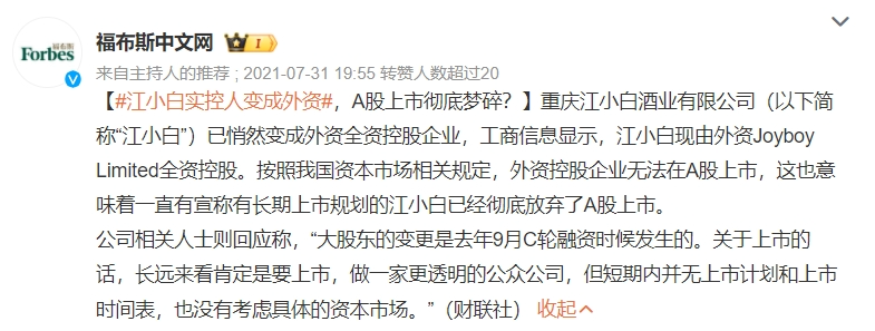 不过,早在2021年江小白控股股东变更为港资公司JoyboyLimited,被业内解读为江小白在为上市做铺垫。当时,江小白方面对此表示,创办Joyboy Limited,是江小白基于公司中长期战略以及相应的资本策略进行的安排;此做法的确是很多已在香港上市的大陆企业较常规的结构,但短期内江小白还没有上市的具体时间表和相关规划。