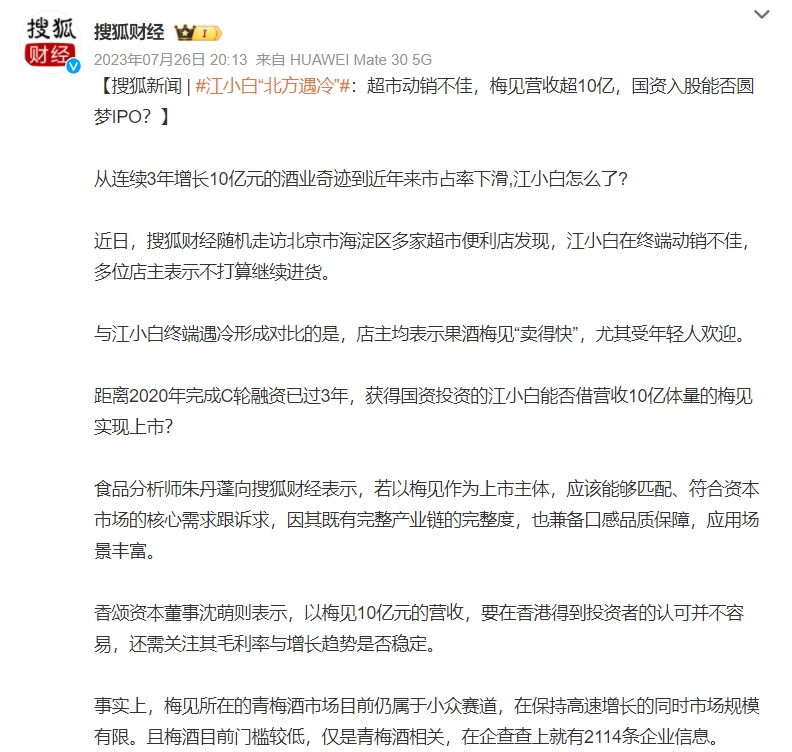 在江小白品牌声势减弱的背景下,有业内人士指出若以梅见作为上市主体,或许能够匹配、符合资本市场的核心需求跟诉求,因其既有完整产业链的完整度,也兼备口感品质保障,应用场景丰富。