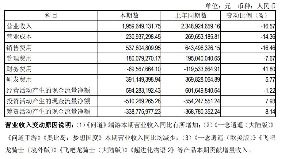 营业收入19.6亿元,同比下降16.57%;归属于上市公司股东的净利润5.18亿元,同比下降23.39%。更要命的是,原本的支柱之一《一念逍遥》(大陆版)上半年收入(-54.81%)、发行投入及利润同比均出现了大幅减少。自2022年以来,吉比特净利润已连续两年出现下滑。