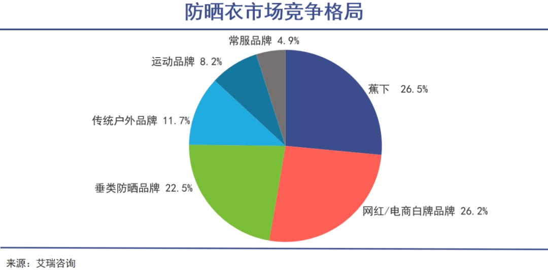 目前,国内进入防晒服饰市场的主要有5类玩家,主要包括户外品牌、垂类防晒品牌、常服品牌、运动品牌和各类白牌商家,甚至一些原本生产羽绒服的品牌也“跨界”卖起了防晒衣。
