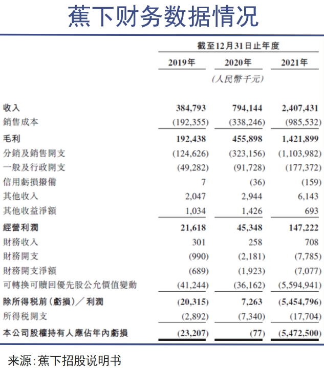 在KOL的造势与明星代言影响力加持下,蕉下产品与品牌声量持续爆炸,但出色的营销能力换回来的实际利润却难以达到管理层的预期。2019-2021年,蕉下的毛利分别为1.9亿元、4.6亿元、14.2亿元,而经营利润仅有2162万元、4535万元、1.47亿元。