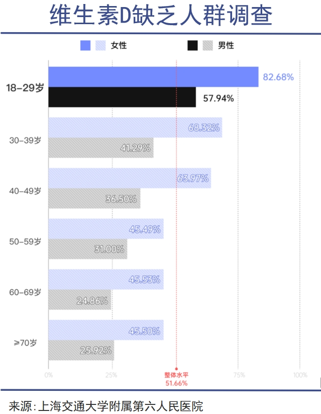 上海的一项医学研究显示,在两万名调查对象中,有51.66%的人存在维生素D缺乏的问题,35.20%维生素D不足。其中18~25岁青年维生素D缺乏率最高,女性占比高达82.6%,这一人群与防晒用品的最大用户群体完全吻合。