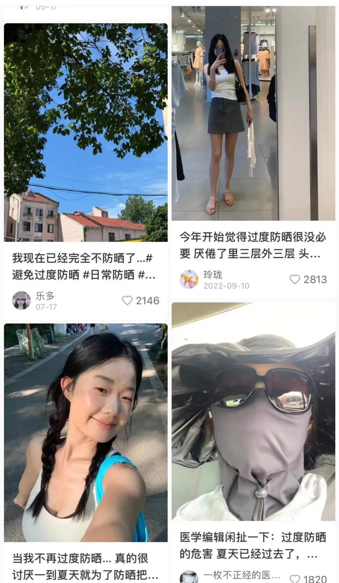 社交媒体平台上出现了不少拒绝“过度防晒”的声音。在小红书上,“过度防晒”相关笔记已有超5万篇,不少女性表示“晒一会儿太阳不会让你变得更糟,很多时候不用活得那么辛苦。”
