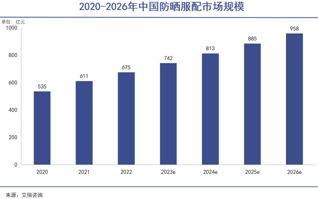 近几年,我国防晒服市场规模持续增长,2023年市场规模达到742亿元,预计2026年将达到958亿元,三年复合增长接近9%,即将迈向千亿级大市场。