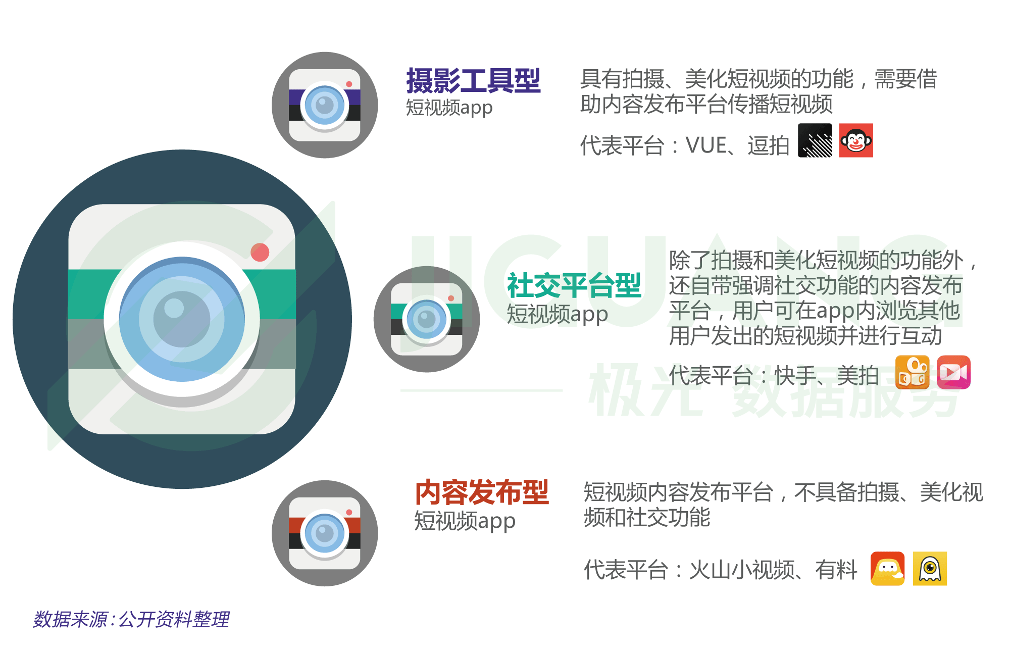在垂直短视频app类别上,目前国内的垂直短视频app主要有三类:摄影工具型、社交平台型、内容发布型。