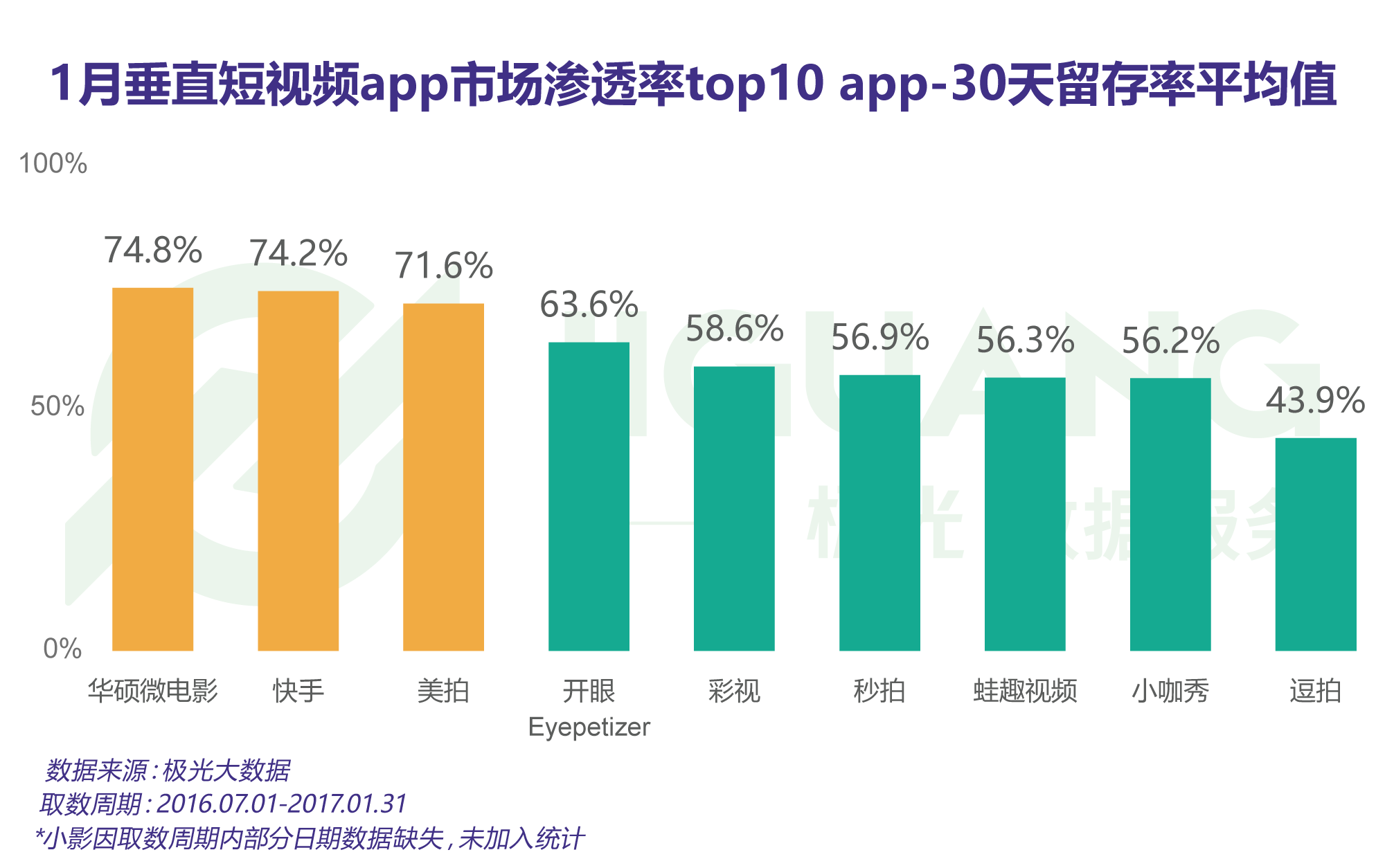 极光大数据显示,用户下载华硕微电影、快手和美拍后,分别有74.8%、74.2%和71.6%的新用户在一个月后仍保留了上述app,反映这部分新用户对目标app体验满意。