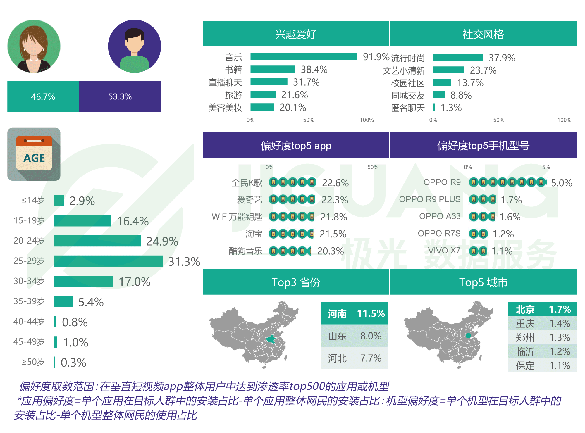 而针对快手用户画像的分析中,极光大数据显示十个用户中约有一个用户来自河南,约五个用户为男性。他们偏好度最高的app和机型分别是:全民K歌、OPPO R9。