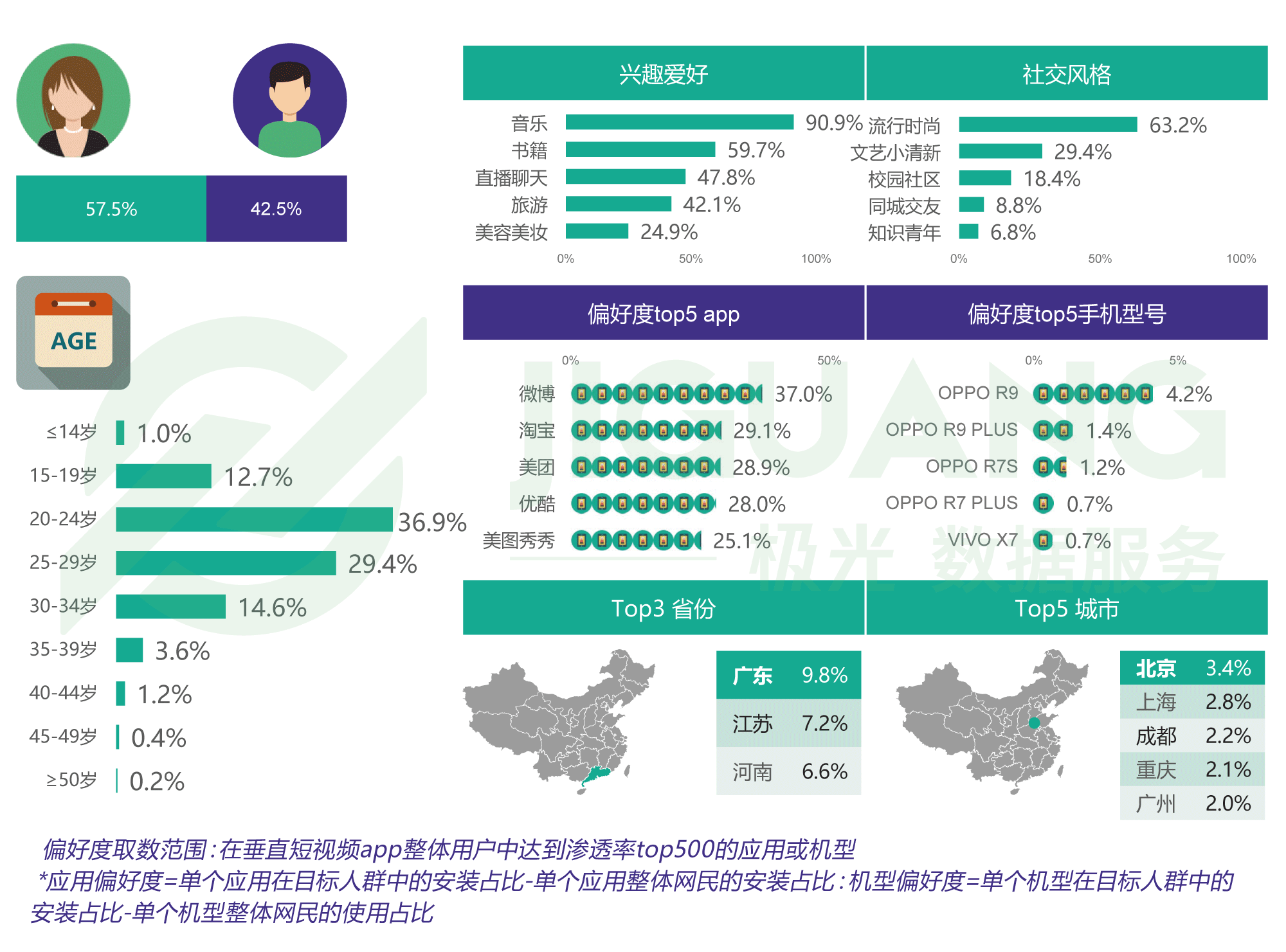- 垂直短视频app用户中约五成为90后,接近七成为女性,超六成用户来自三线及以下城市