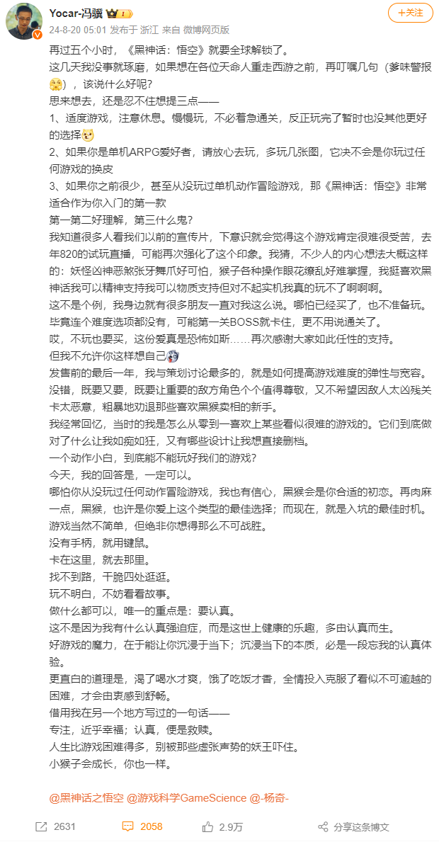 游戏科学创始人、CEO,《黑神话:悟空》制作人冯骥8月20日在《黑神话:悟空》全球解锁前五小时在微博表示,“如果你是单机ARPG爱好者,请放心去玩,多玩几张图,它决不会是你玩过任何游戏的换皮。”“如果你之前很少,甚至从没玩过单机动作冒险游戏,那《黑神话:悟空》非常适合作为你入门的第一款。”