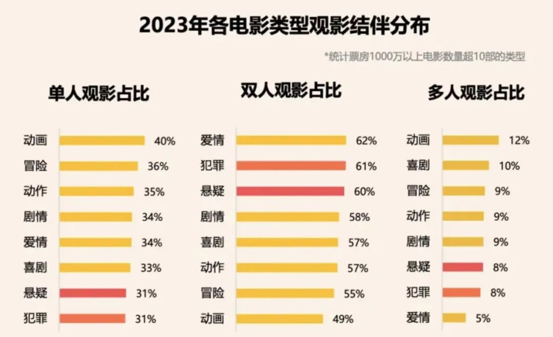据灯塔研究院《2023中国电影市场年度盘点报告》,2023年各电影类型观影结伴分布方面,动画类型单人观影占比与多人观影占比最高,双人观影占比最低。