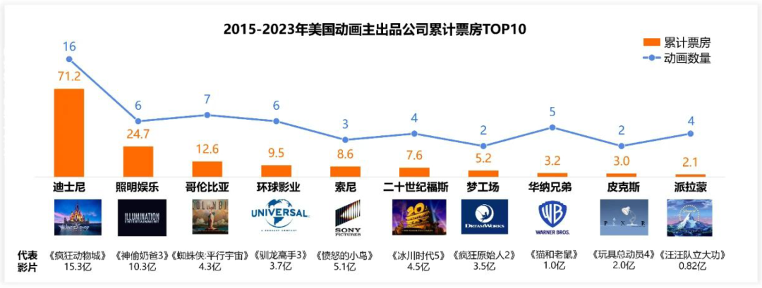横店影视、基因映画、北京精彩分别凭借一部作品,《西游记之大圣归来》《罗小黑战记》《雄狮少年》挤进前十,而其他公司几乎都有至少六部作品。