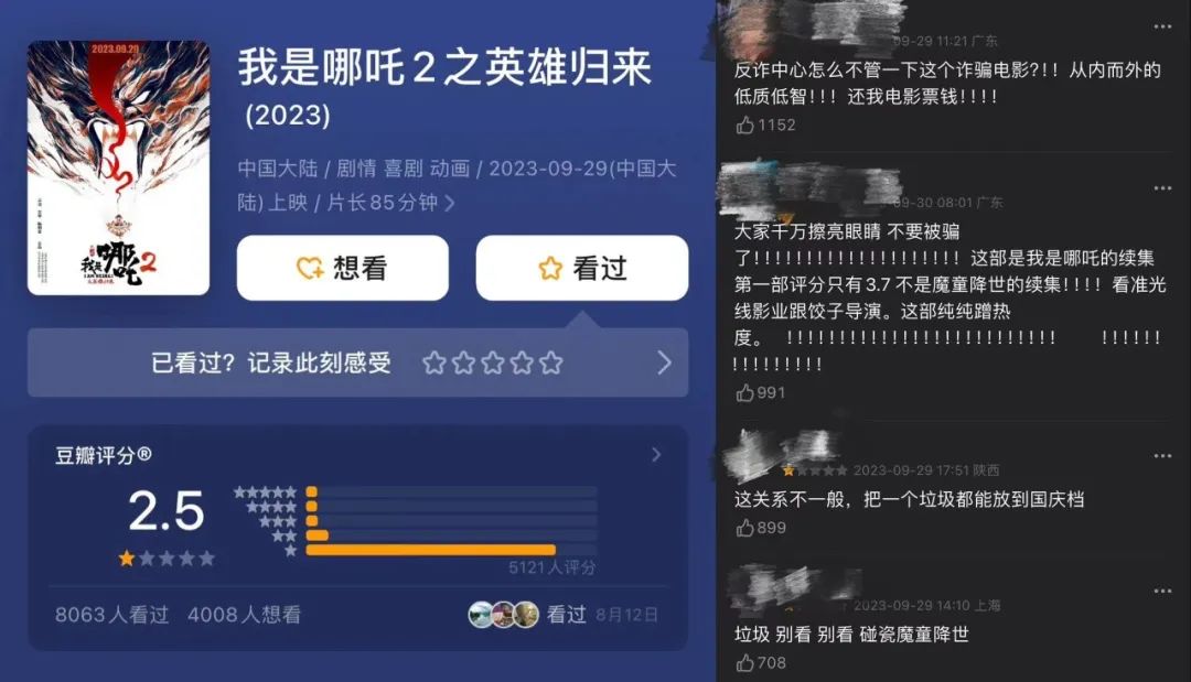 比如,去年《我是哪吒2之英雄归来》上映时,曾被观众误以为是蹭《哪吒之魔童降世》的续作,纷纷称其为“诈骗电影”。但这部电影其实是2016年上映的《我是哪吒》的续作,对准的目标受众也是儿童,最后迎来口碑与票房双低的局面。