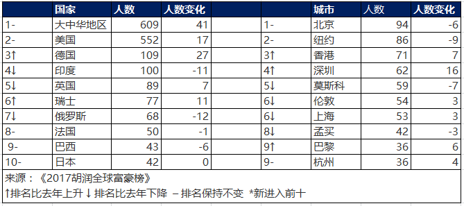 在上榜的十亿美金富豪中,大中华地区以609位第二年领先于552位的美国。大中华区和美国拥有全球一半的十亿美金富豪。德国今年表现不俗,超越印度来到第三。印度位列第四。阿联酋和印度尼西亚首次进入前20位。孟加拉国诞生了第一位十亿美金富豪,上榜企业家共计来自68个国家。