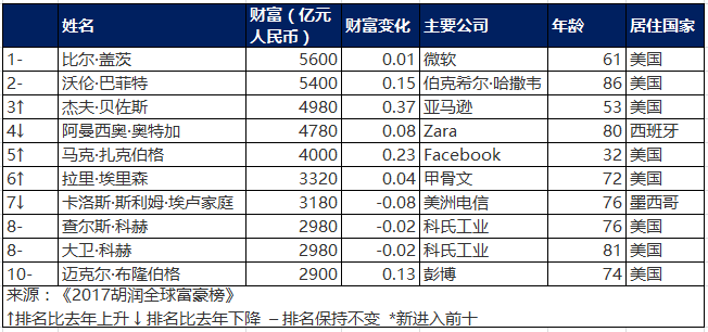 前十中有8人来自美国。杰夫·贝佐斯、马克·扎克伯格、沃伦·巴菲特财富增长明显。贝佐斯财富上涨37%,扎克伯格财富上涨23%,巴菲特财富上涨15%。今年全球十大富豪中没有新人上榜。