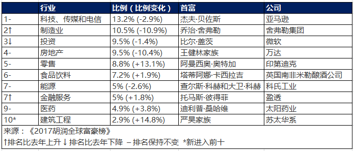 科技、传媒和电信、制造业和投资业诞生了数量最多的全球十亿美金富豪,占到总人数的三分之一。科技、传媒和电信上榜富豪中,71%来自中国和美国。