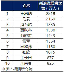 王思聪和马云是中国最具社交媒体影响力的企业家,他们在新浪微博的粉丝数均超过2000万,其次是潘石屹,超过1800万。