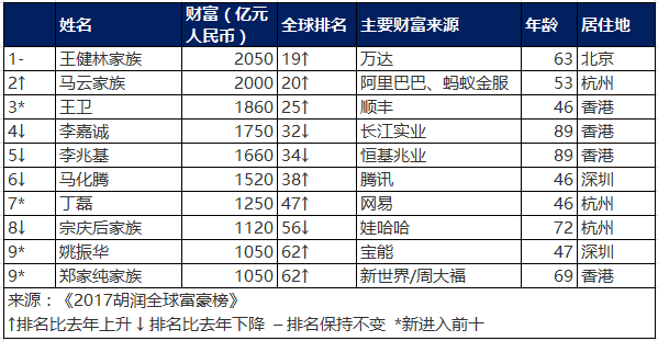 大中华区十大富豪,王健林、马云、王卫位列前三