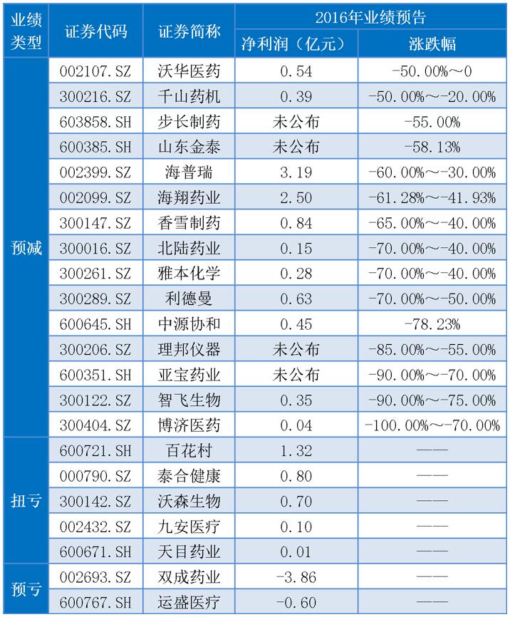 同样值得注意的是,在仅有的两家预亏公司中,双成药业(002693.SZ)系2012年登陆中小板以来首次出现业绩亏损。有意思的是,双成药业在此前披露的2016年三季报中,曾预计净利润的亏损范围在2.3亿至2.6亿元;短短两个月后,预计的亏损额度却大幅上升为3.8亿至3.95亿元。