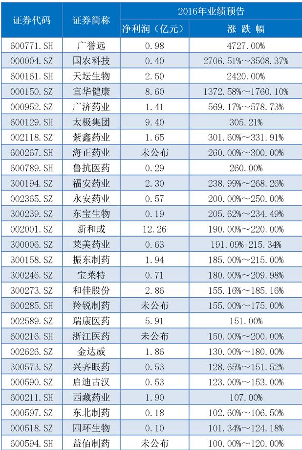 可以看到,广誉远(600771.SH)、国农科技(000004.SZ)、天坛生物(600161.SH)业绩增长最为突出,最少达到24倍,最高达47倍。对比发现,三家企业的业绩表现一定程度上受到同期低基数的影响。数据显示,上述三家企业2015年净利润分别约为0.02亿元、0.01亿元、0.10亿元,而三家企业2016年业绩预告为0.98亿元、0.40亿元、2.50亿元,基数效应明显。