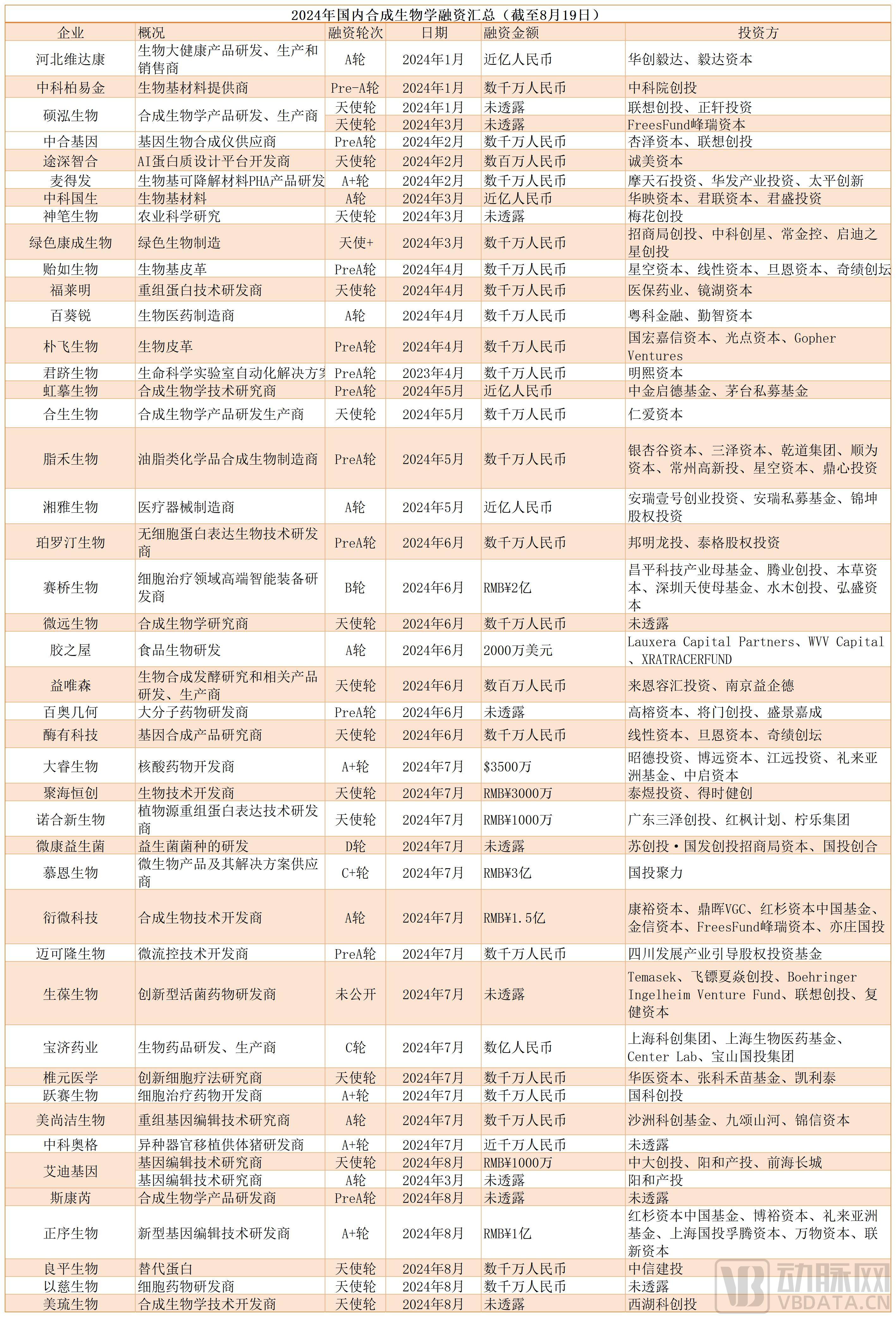 2024年合成生物学投融资企业(截至8月19日) 动脉网整理