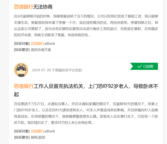 在黑猫投诉平台上,以“百信银行”为关键词搜索,涉及该行的投诉达4695条,投诉类别不乏乱上报征信记录、盗取个人信息导致征信有记录、利息收取不合理等,其中被投诉的重灾区是暴力催收。