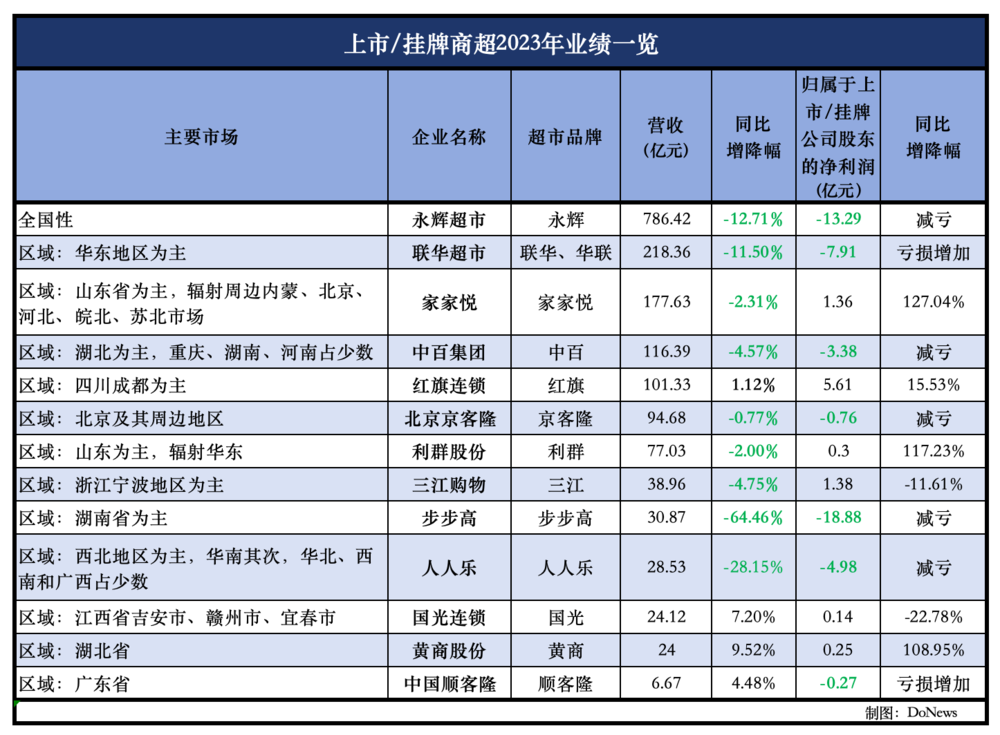 消费群体流失,传统商超的业绩也一言难尽。据DoNews不完全统计,目前上市/挂牌的传统商超共有13家,除永辉超市在全国各大区域有不错的发展之外,其它都为区域性品牌。